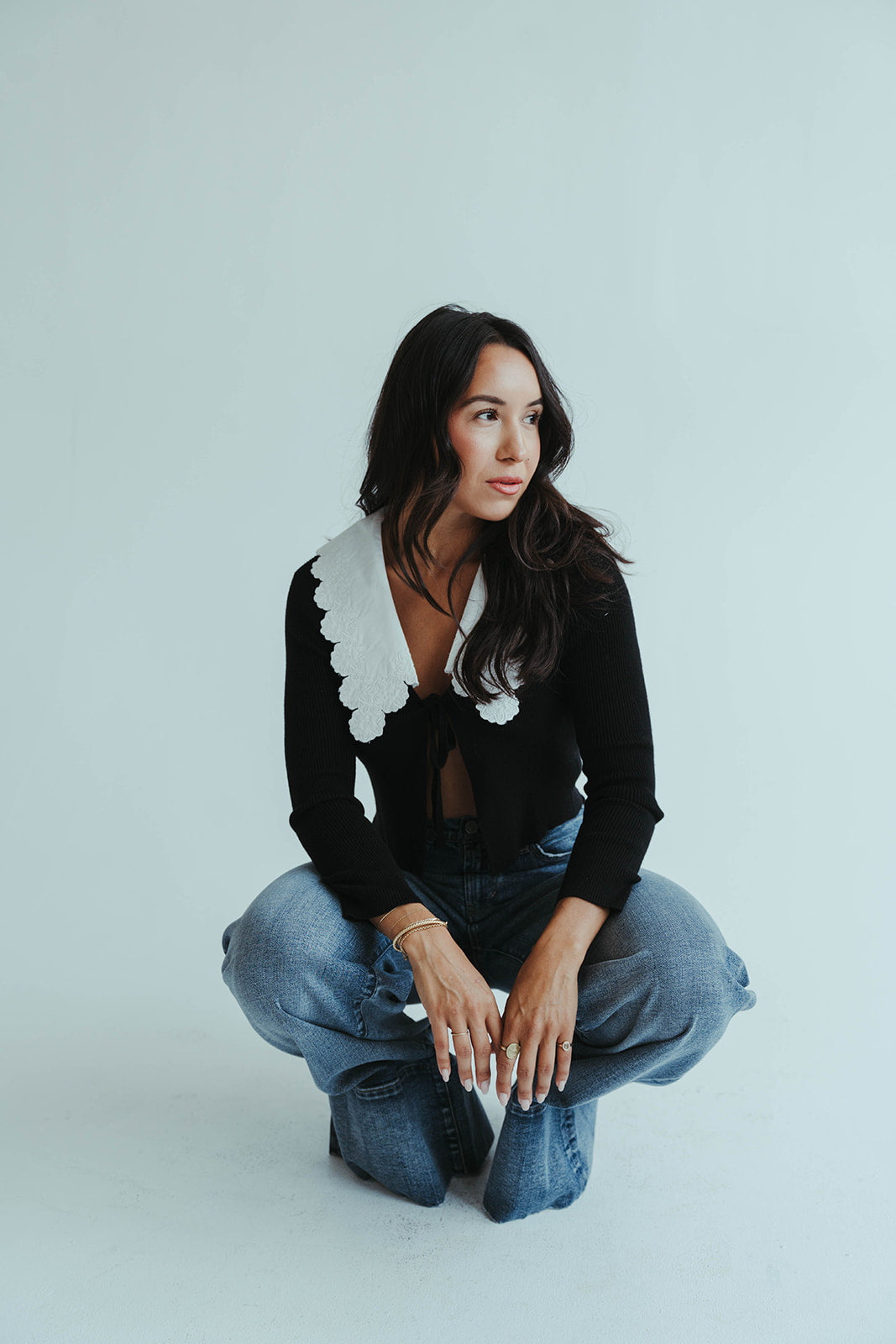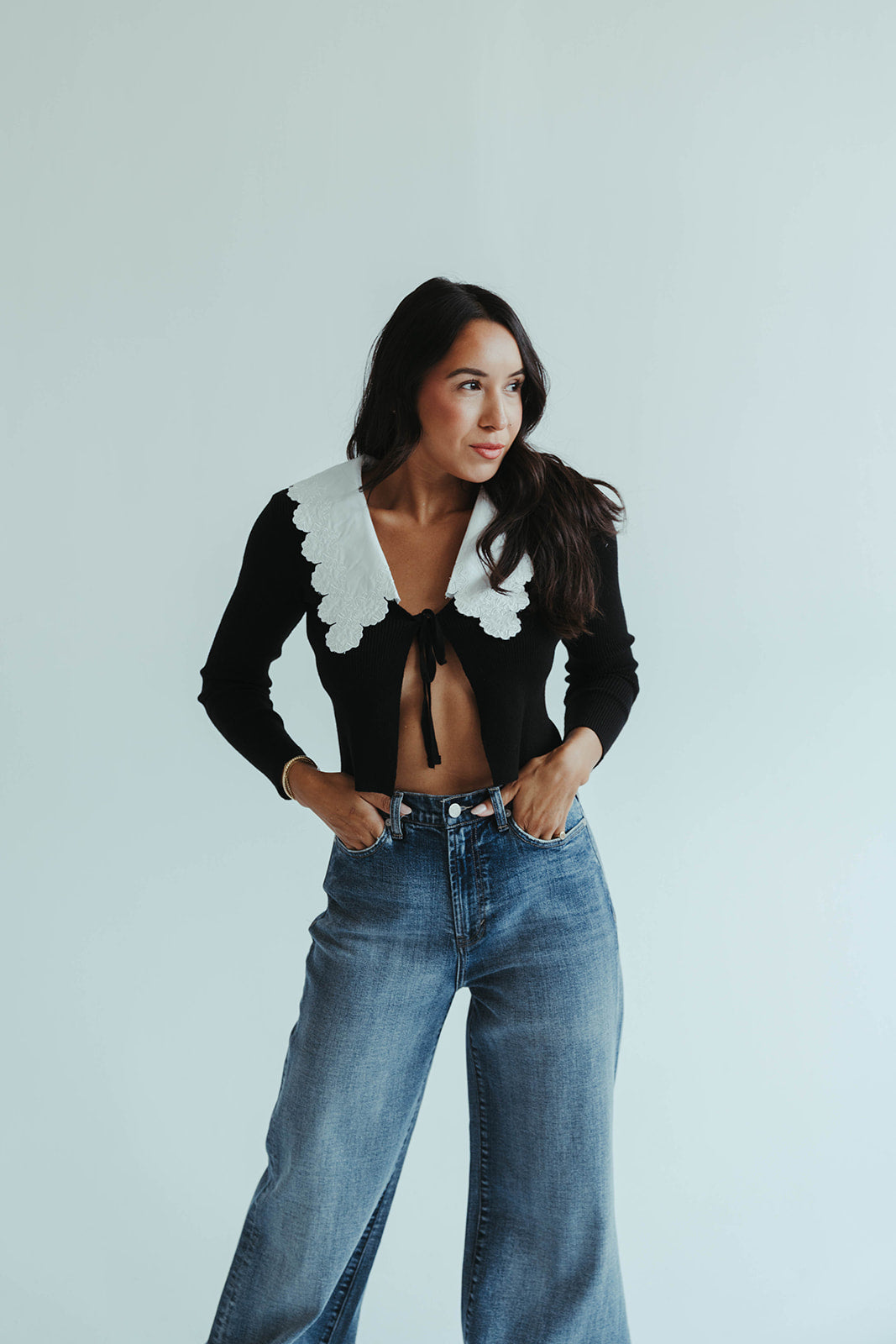 • Cropped black knit cardigan with versatile styling options