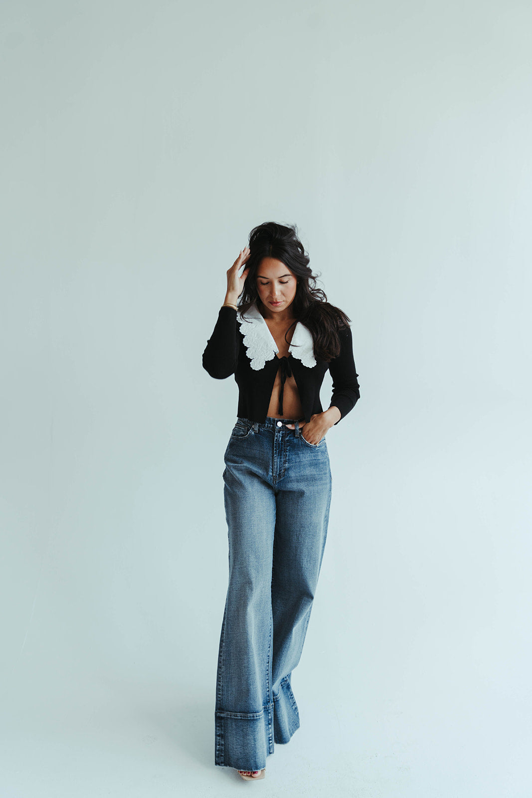 • Cropped length hits at the waist for easy layering